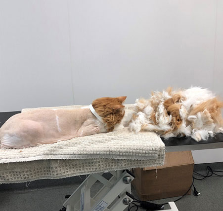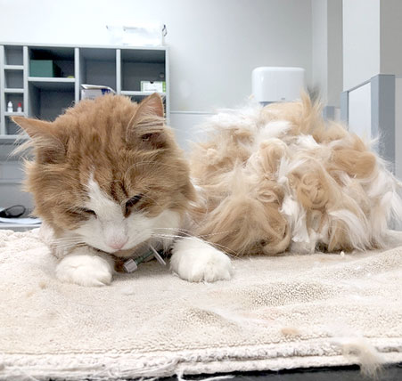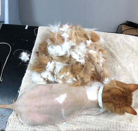 Jaffa was started on a special fur ball diet to try to prevent recurrence but unfortunately, his attention to appearance was too great and his owner brought him back to see Georgina early in February 2019 as his vomiting had started again. At this point there was no choice but to remove the source of the problem. Jaffa’s beautiful coat had to be clipped away to ensure his continued health, and although he was not pleased with his new hairstyle, Jaffa was spotted showing off his new jumper to the nurses later that day.